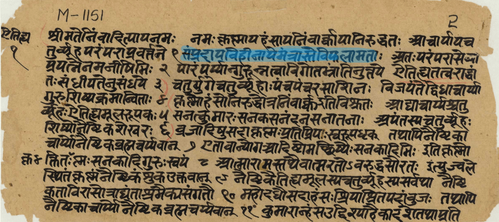 Sampradāya according to the commentator here means śiṣṭānuśiṣṭagurūpadiṣṭo mārgaḥ sampradāyaḥ which means that sampradāya is the path instructed by a spiritual master who was taught by a learned preceptor. Learned preceptor here means śiṣṭatvaṃ vedaprāmāṇyābhyupagantṛtvam one who follows the authority of Vedas which is commonly accepted in all schools of Hinduism. So, sampradāya is a lineage of preceptors who accept the authority of Vedas. So, basically this definition applies to all the schools of Hinduism.